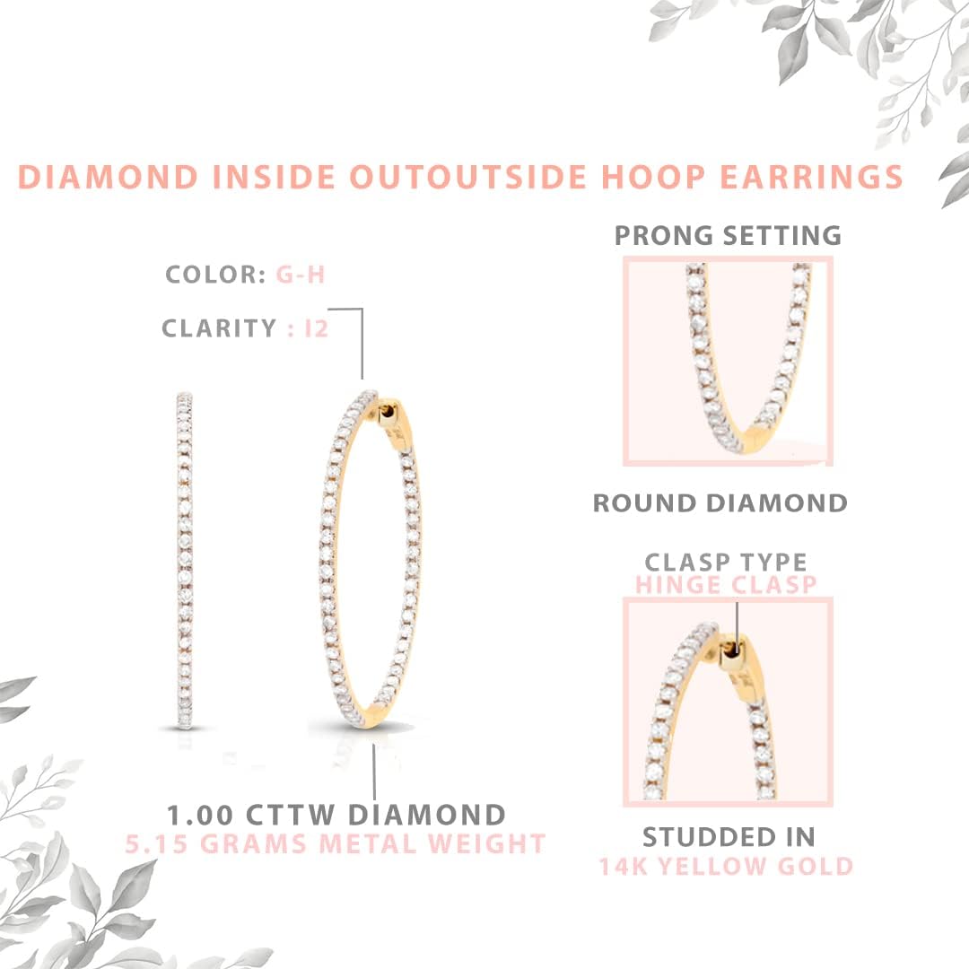 Femme Luxe 1.00 cttw Diamond Inside-Outside Large Hoop Earrings for Women, 14K Yellow Gold, Hypoallergenic, Giftable Jewelry (Diamond Color: GH, Clarity: I2)