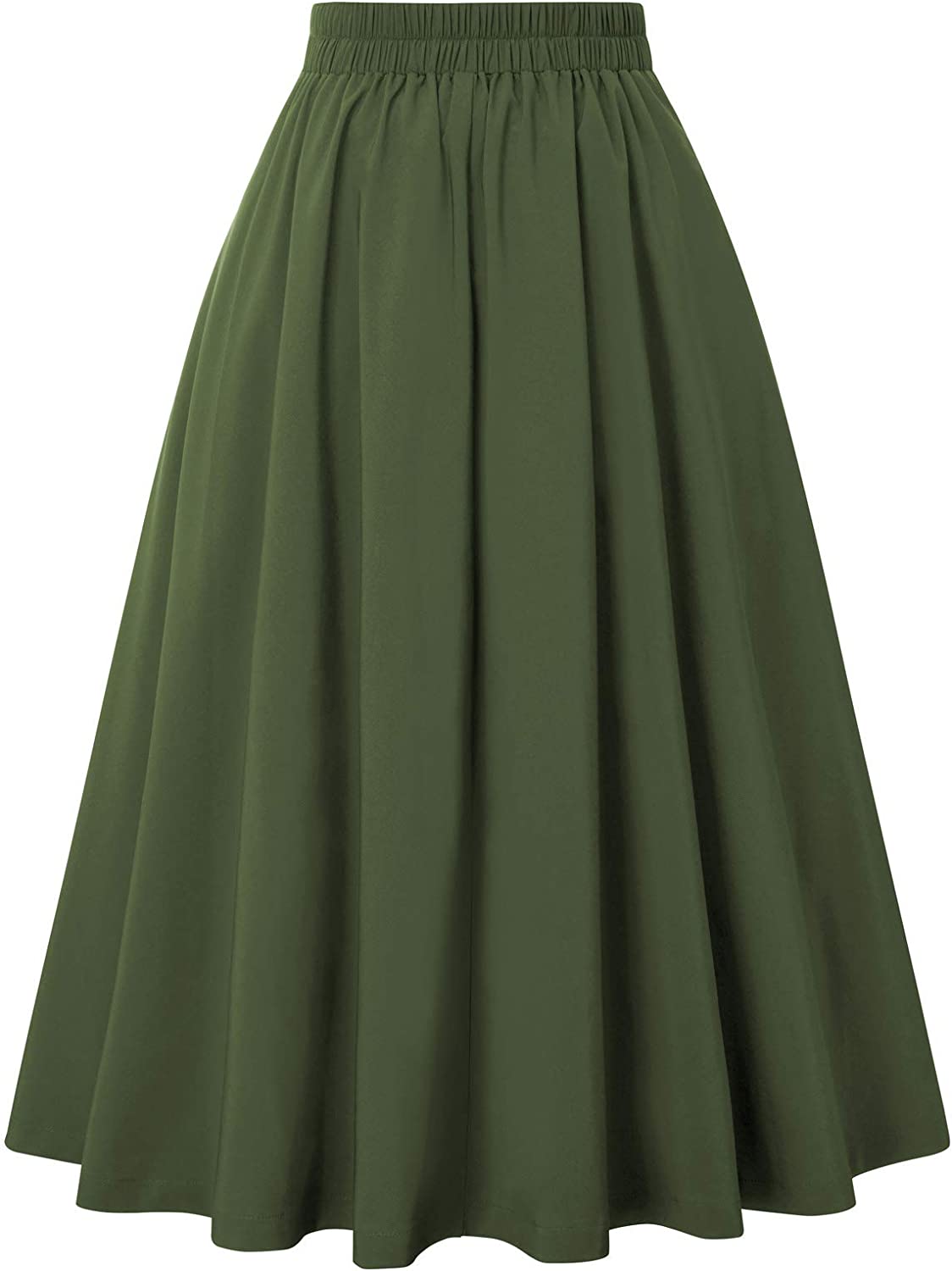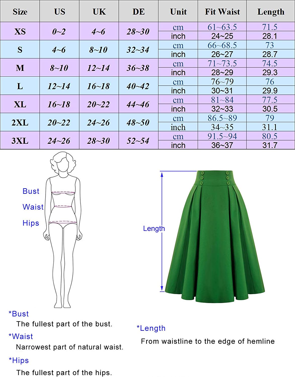 Features:Pleated skirt midi, flared A line silhouette, elastic waist,6 decoration buttons, with 2 open pockets