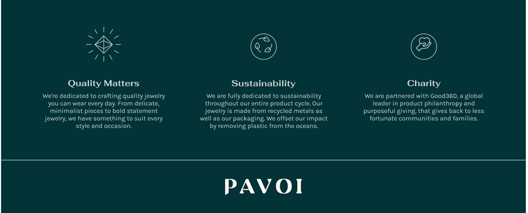 • ✦ SUSTAINABILITY ✦ PAVOI is dedicated to sustainability throughout our entire product cycle. Our jewelry is made from 100% recycled materials and we package in 99% recycled and compostable materials. We work to reduce our carbon emissions and offset plastic consumption by removing 275,000 bottles from oceans annually. We are committed to maintain a balanced and eco-friendly business that minimizes our environmental impact. Trust that PAVOI is continuously working towards a greener future.