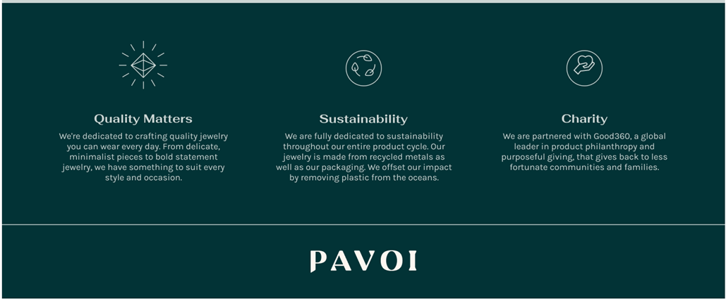 • ✦ SUSTAINABILITY ✦ PAVOI is dedicated to sustainability throughout our entire product cycle. Our jewelry is made from 100% recycled materials and we package in 99% recycled and compostable materials. We work to reduce our carbon emissions and offset plastic consumption by removing 275,000 bottles from oceans annually. We are committed to maintain a balanced and eco-friendly business that minimizes our environmental impact. Trust that PAVOI is continuously working towards a greener future.