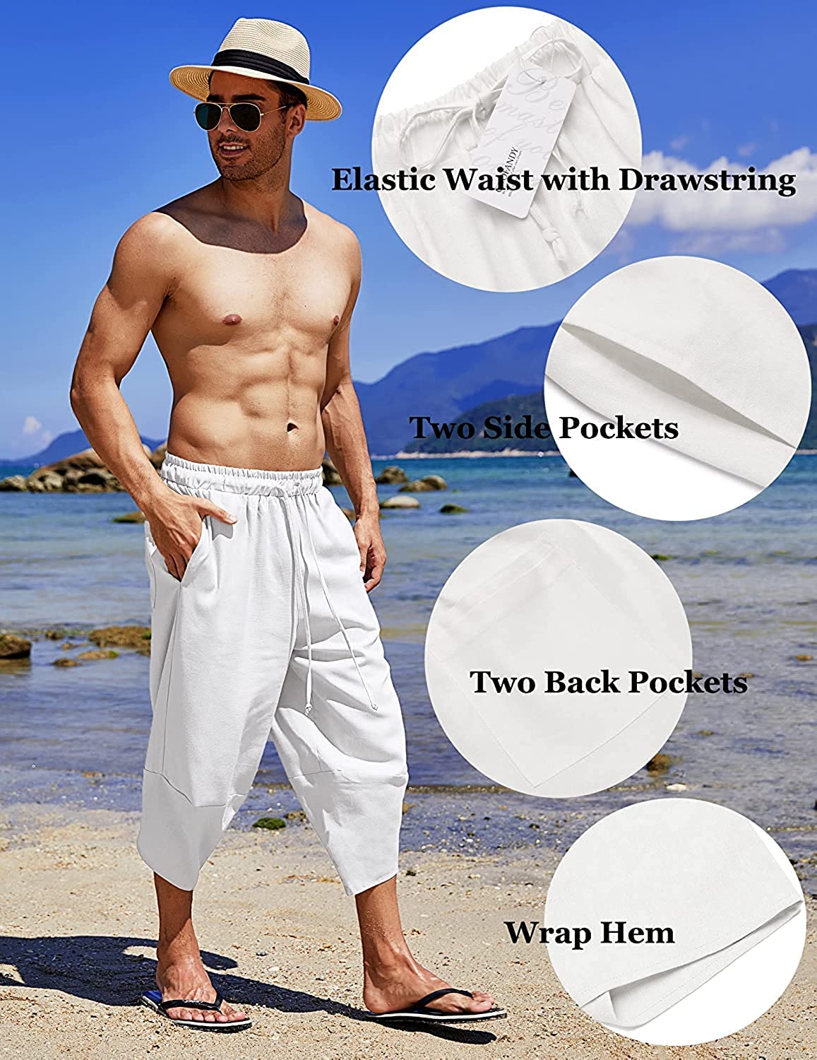 Mens Linen Harem Capri Pant Lightweight Loose 3/4 Shorts Drawstring Beach pants