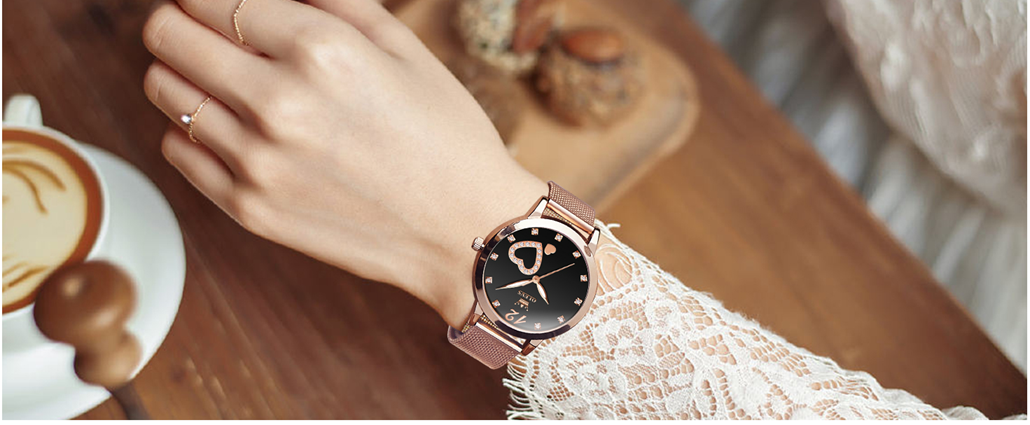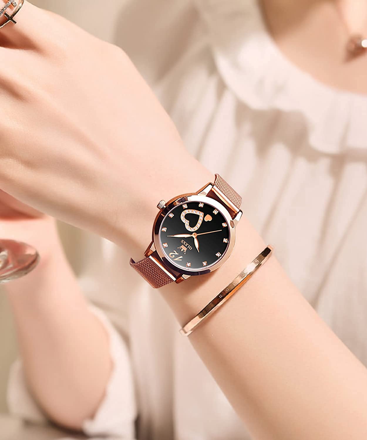 • ?【Design Concept And Size】 Dress Ladies Watches Gold Dial with love theme,Stereo pointer and double heart match,With scale inlaid rhinestones,Show love and elegance.Diameter 36MM(1.42inch), Ladys watch gold case thickness 9MM(0.35inch), Length:22CM (8.66inch),Watch width 16MM (0.63inch),Casual woman watch weigth:60G,High hardness coated glass mirror is shockproof
