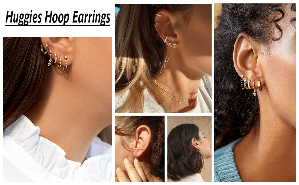 • ?Various Styles?- One order includes 5 pairs huggies hoop earrings set, which means a pair of small hoop earring + a pair of cz huggies hoop earring + a pair of cz beaded hoop earring + one pair of cz dangle twisted earring + one pair of chain cuff earring. Suitable for all ages making you elegant and sexy every moment.