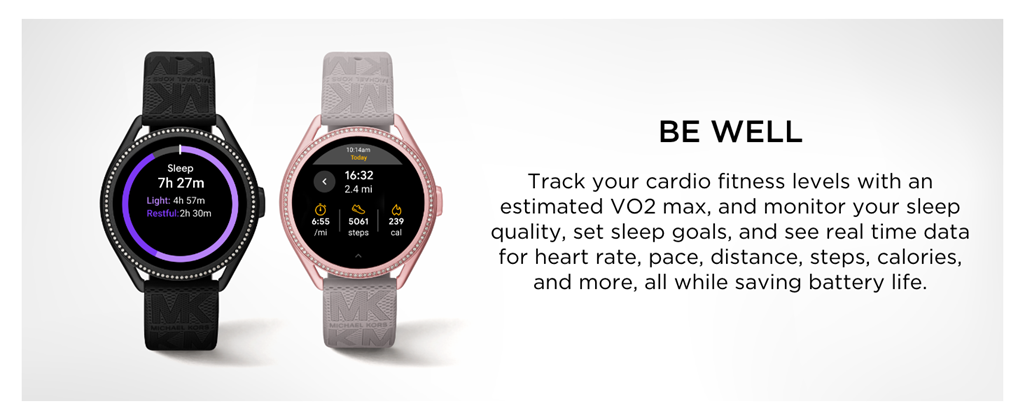 • Health and fitness: Automatically tracks activity goals, steps, sleep, heart rate, cardio level and more. Activity modes with tethered GPS keep you on track with your distance and path. Advanced sensors provide the data to power all your health and fitness apps. New wellness enhancements allow you to track sleep history, monitor your restfulness and set sleep goals