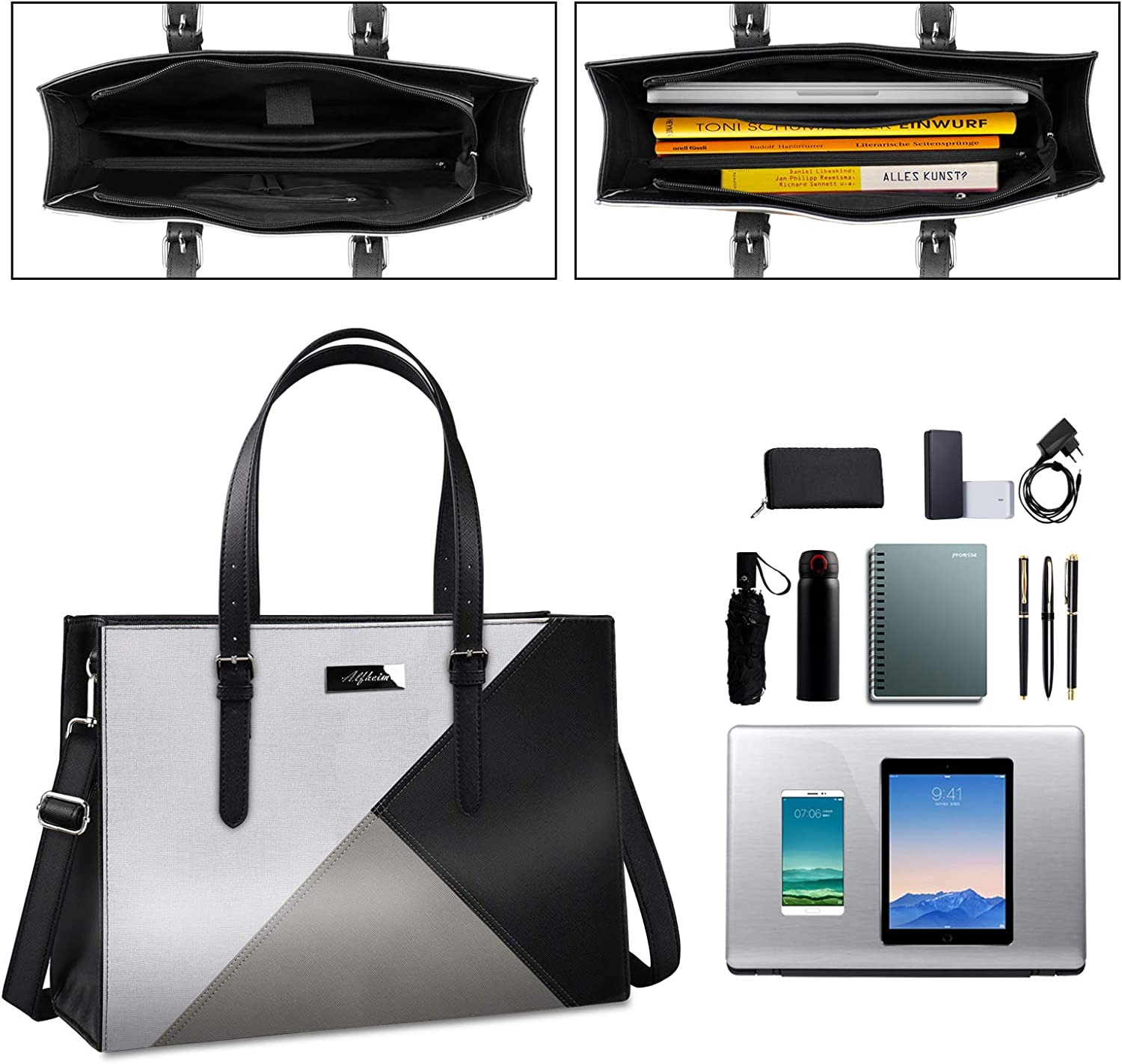 【Premium Material】Alfheim laptop bag is made of premium PU leather and polyester lining. High-quality leather makes laptop handbags for women water-repellent, scratch-resistant and more soft and durable. Adopting a sturdy top handle zipper and professional padded pocket which keep your laptop and essentials safe. The fashionable stitching color makes this large business woman bag become a forefront of fashion trends.