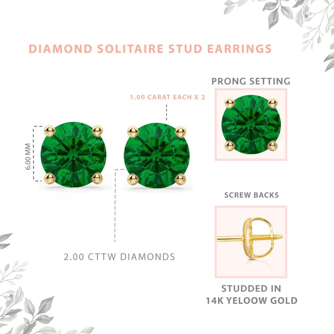 • FINEST QUALITY MATERIALS: Green Diamond Solitaire Stud 2.00 ct. t.w. Green Diamonds studded in nickel free, hypoallergenic 14K Yellow Gold. Each diamond is 6mm in size and weighs 1.00 carat per stone. Diamonds are set in a sturdy yet elegant 4-prong basket setting. All materials are 100% conflict free and ethically sourced. The earrings come with a sturdy screw-back for a secure, comfortable fit.