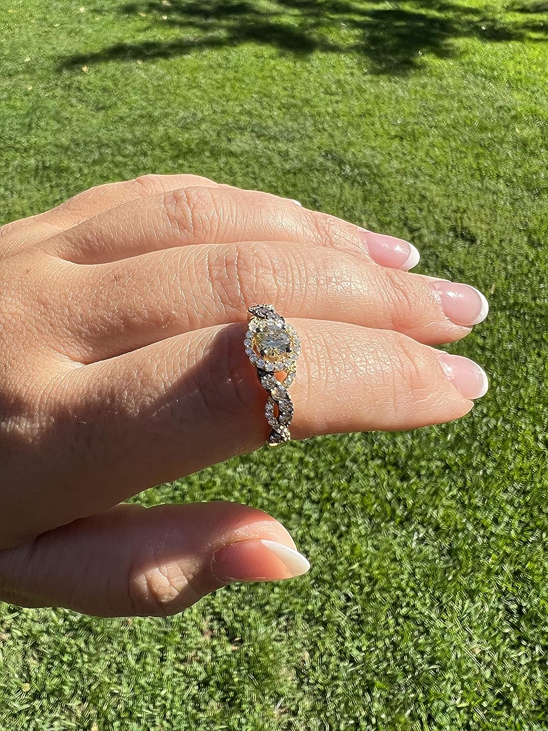 • UNMISTAKABLE ELEGANCE - This glamorous handcrafted 14K yellow gold ring by Le Vian features a large round fancy brown diamond haloed by bright white diamonds. The ring has a crossover split shank with bands of white diamonds and brown diamonds in black rhodium-plated settings that make their color pop by twisting over one another three times. This gorgeous ring is the high-profile statement piece you’ve been looking for. It’s sure to attract compliments at your next soiree or special event