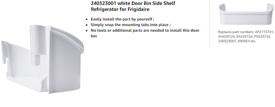 • ❤PART NUMBER 240323001 : The refrigerator white door bin Bottom door bin replaces numbers AP2115741, AH429724, EA429724, PS429724, 240323007, 890954 etc. ❤❤❤Not all Frigidaire refrigerators are suitable. If your Frigidaire refrigerator model starts with "LFSS" or "FGSS", then the 240323001 door bin will not be compatible.