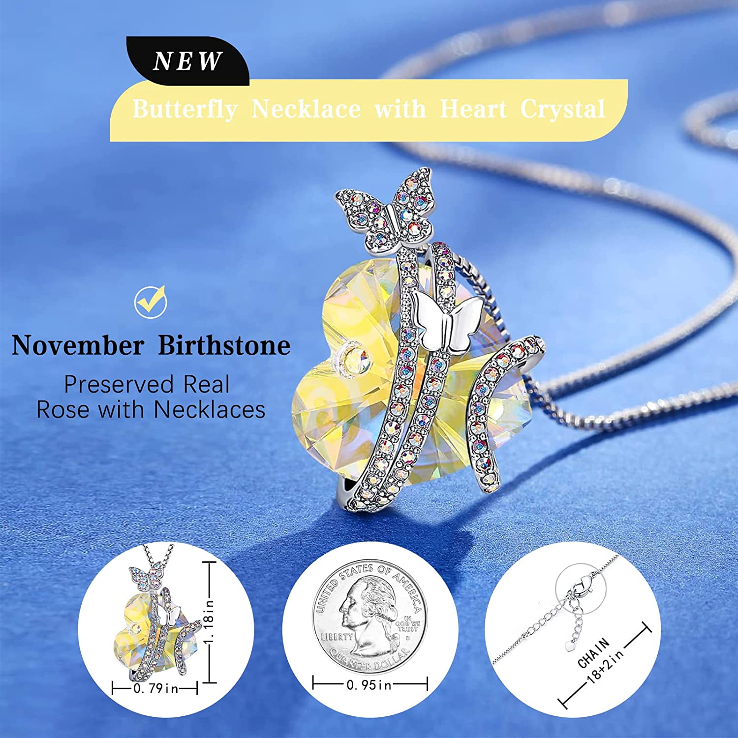 • Butterfly Necklace delivered in an preserved real rose jewelry box, easy gift-giving, save your valuable time and effort. Our butterfly birthstone necklace can provide 12 colors crystals (Each color corresponds to a birth month) and 2 kinds of packaging form, to meet your different needs
