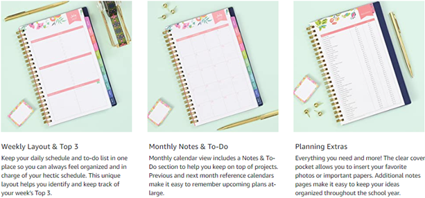 • Weekly calendar view per two-page spread contains ample lined writing space for your daily schedule and to-do list, and extra planning sections for your week's top 3