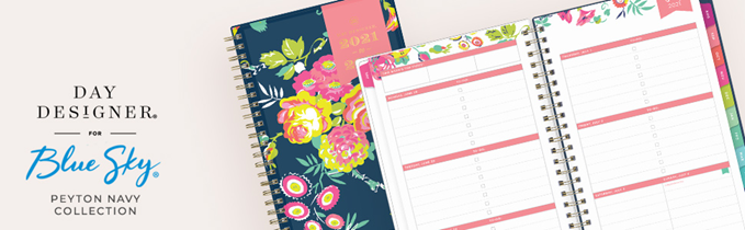 Whether you're a working professional, full-time mom, a teacher or a diligent student, it’s easy to feel overwhelmed and pulled in a million directions. Day Designer for Blue Sky is a simple and easy system created to help you find balance, focus and productivity. This planner isn't magic and it can't live your life for you. But it can, through a simple, guided framework, help you figure out a focus for intentional living. It can be a trusted tool for setting goals, creating a plan and taking action each and every day. This exceptionally built planner exudes quality, design elements and inspired productivity in one well-organized ensemble. It will teach and guide you with a clear path and directions to organize your day, your tasks, assignments, and to-dos to achieve your goals. This academic planner is ideal for business professionals, teachers, professors, administrators, students or anyone involved in education. You will feel more organized and in charge of your hectic schedule, while carrying this harmoniously built Day Designer for Blue Sky planner. The Peyton Navy pattern with bold, colorful florals will make a subtle fashion statement with friends and peers around you. A well-designed day is a well-lived life! Blue Sky creates modern and sophisticated organizational planners and calendars to fit the scheduling needs of busy people - whether business professionals, college students, teachers, or anyone with appointments to make note of. Keep your life organized with our full line of products including desk pad calendars, wirebound tabbed weekly and monthly planners with contacts and notes pages to accommodate your scheduling needs, and laminated two-sided wall calendars, all in a variety of colors and patterns to suit your lifestyle and personality.