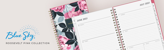 Plan your year in style with the beautiful florals and bold colors of the 2021-2022 academic year Roosevelt Pink collection. This stylish weekly and monthly planner will keep you organized everywhere you go. Simple page designs add a touch of sophistication and offer plenty of room for all of your important information. Designed with practicality and ease of use in mind, this academic agenda's monthly calendar tabs allow for easy access to each month’s plans while weekly views offer ample writing space for detailing each day. High quality white paper provides clean writing space for jotting down your appointments, to-dos and reminders. Use this dated academic planner to keep track of your appointments, and to write down notes and ideas in one place. Durable coated tabbed dividers are long lasting and make accessing information a breeze. Premium quality covers and twin-wire binding provide reliable durability for daily use. Stay on track throughout the academic year with this 8.5 x 11 planner dated July 2021 - June 2022. Mix and match with other Roosevelt Pink Collection planning products from Blue Sky to organize your daily life. Blue Sky creates modern and sophisticated organizational planners and calendars to fit the scheduling needs of busy people - whether it’s for business professionals, college students, teachers, or anyone with appointments to make note of. Keep your life organized with our full line of products including desk pad calendars, wirebound tabbed weekly and monthly planners with contacts and notes pages to accommodate your scheduling needs, and laminated two-sided wall calendars, all in a variety of colors and patterns to suit your lifestyle and personality.