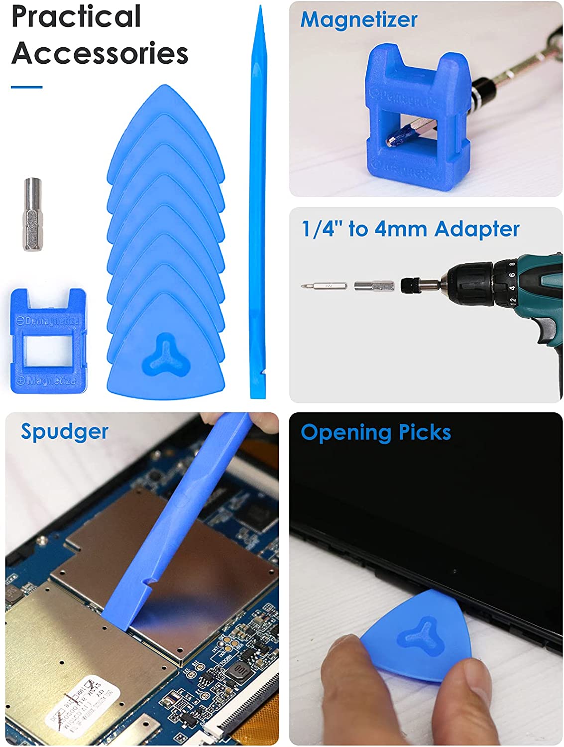 - 【Practical Accessories】The magnetizer demagnetizer tool can adjust the magnetism of the bits, strong magnetism for grabbing screws, and weak for protecting sensitive electronics. One flexible extension shaft helps to reach tight spot. The 1/4" to 4mm driver adapter allows the bits to be used by electric screwdriver. The opening picks and spudger help you open tech devices and safely remove components with ease