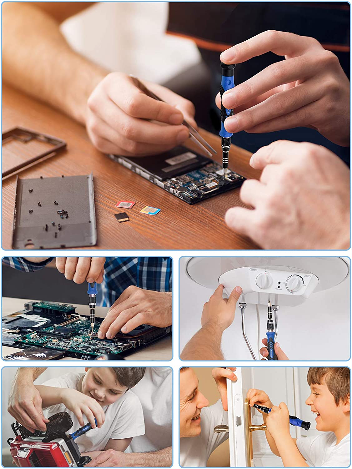 - 【Humanized Design】The small screwdriver kit has been upgraded for maximum humanization, makes your repair job easier and more efficient. Super smooth swivel cap allows you to apply constant pressure while rotating. The PP+TPR handle is ergonomic designed to provide comfortable grip and enough torque. Magnetic bit holder transmits magnetism through the screwdriver bit, helping you handle tiny screws and electronic parts