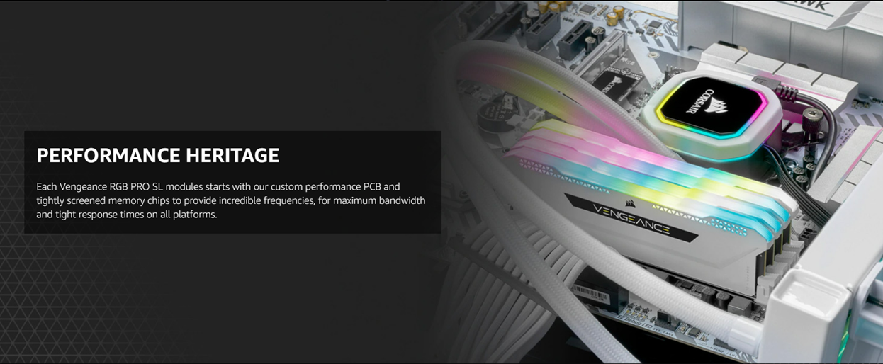CORSAIR VENGEANCE RGB PRO SL DDR4 memory lights up your PC while delivering peak performance in a compact form factor just 44mm tall for wide compatibility with CPU coolers. Every module boasts ten bright, individually controlled RGB LEDs for brilliant illumination. Take control with CORSAIR iCUE software and completely customize every module’s lighting to match your system, create your own custom lighting profiles, and synchronize lighting across all your CORSAIR products. A custom PCB provides superb signal quality for superb performance and stability on the latest Intel® and AMD DDR4 motherboards, while tightly screened memory chips unlock superior overclocking ability. For mesmerizing, completely customizable RGB lighting and the best in DDR4 performance, equip your PC with VENGEANCE RGB PRO SL.
