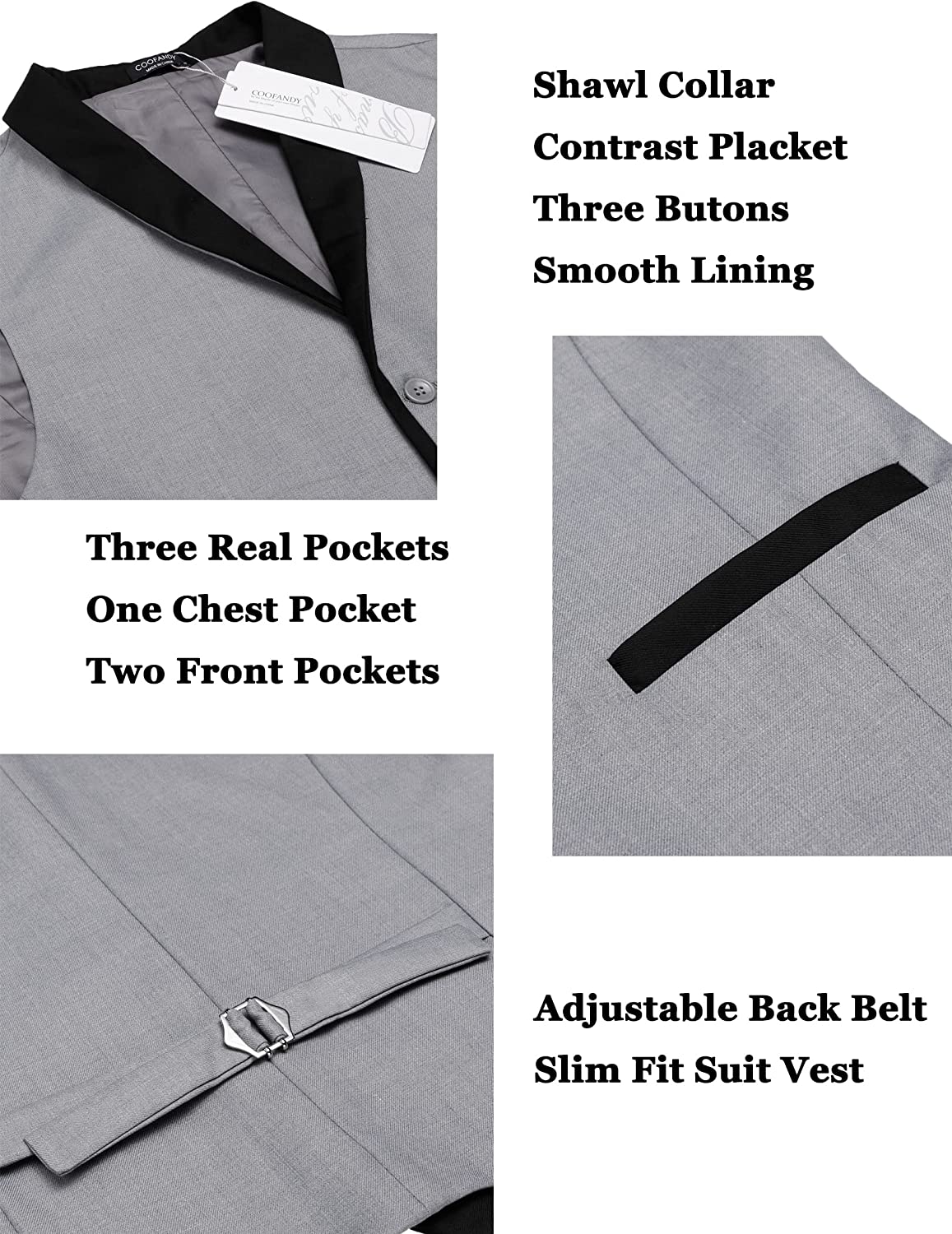 • The Men's suit vest design with shawl collar, Two real side pockets and one real chest pocket;Adjustable back belt,3 Buttons V-neck men's dress vest,New Stylish slim fit style black grey,blue vest for men