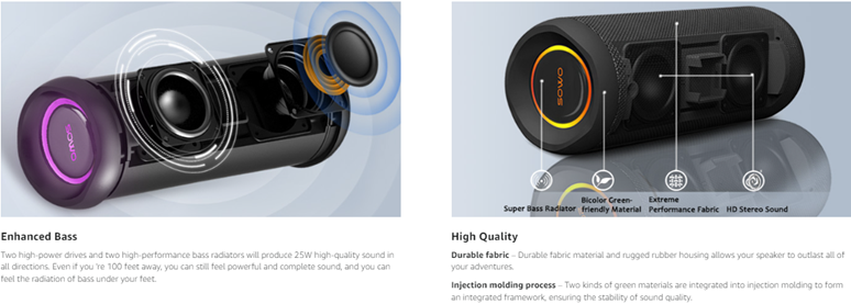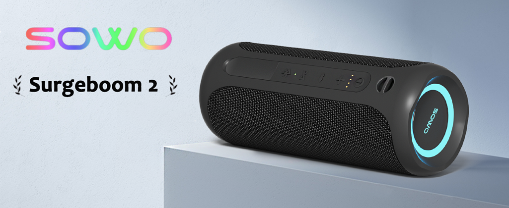 • [BRILLIANT SOUND WITH RGB COLORFUL LIGHT]: SOWO speaker Bluetooth wireless based on advanced DSP technology, surgeboom 2 is equipped with 25w stereo audio drivers and two wide bass passive radiators, which perfectly achieves stereo sound effect and high volume output. The radiator is also loaded with cool LED lights with dual 256-level brightness display.