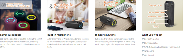 • [16H POWERFUL BATTERY]: SOWO Bluetooth speaker portable wireless built with a high power capacity super electric vehicle battery, can be recharged more than 1000 times, and the maximum actual capacity will not be reduced. Compared to the 300 times rechargeable battery of ordinary speakers, the working life is 3-4 times, and has twice the voltage to provide stronger power. Let's enjoy music day to night.