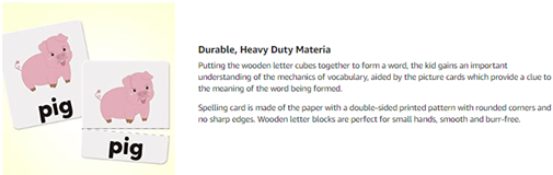 - The cards have basic words that are easy for toddler’s early years of learning. It can help your kid’s spelling, matching and memory skills, to match letters on the cubes with letters on word and spell the letter name of the object.