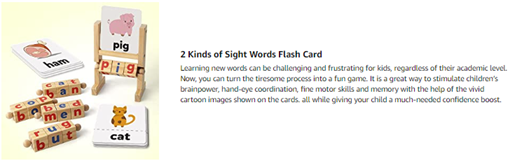 - If your kid can not recognize words by sight- you can Place the sight words flash card in the card slot, don't cover the words on the card, then ask them to string the cubes on the slot to make a correct word according to the word prompt of the card.