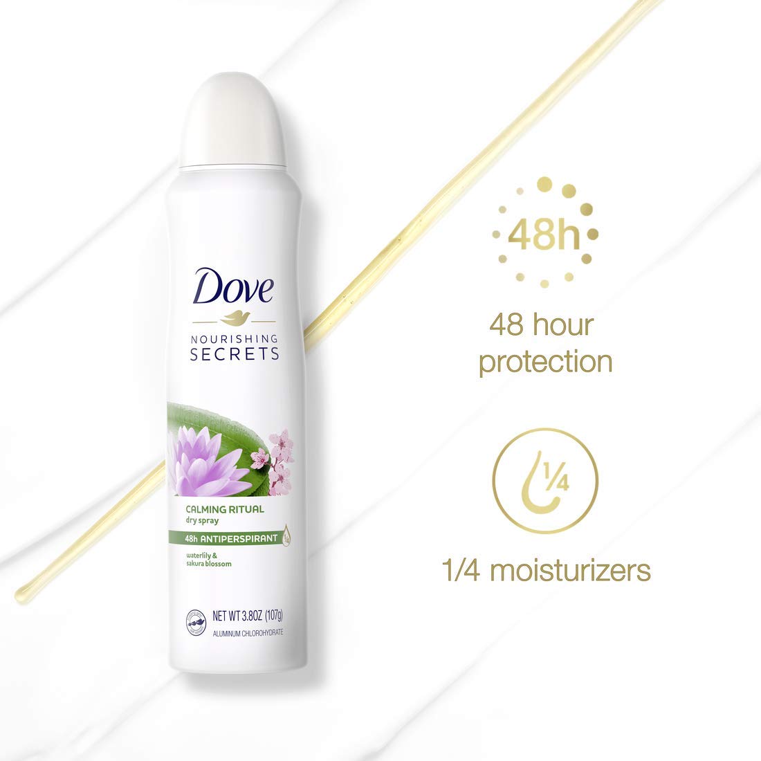 • 48H protection: Dove Nourishing Secrets dry Spray Antiperspirant Deodorant waterlily & Sakura blossom keeps your underarms dry for up to 48 hours while being luxuriously kind to your skin