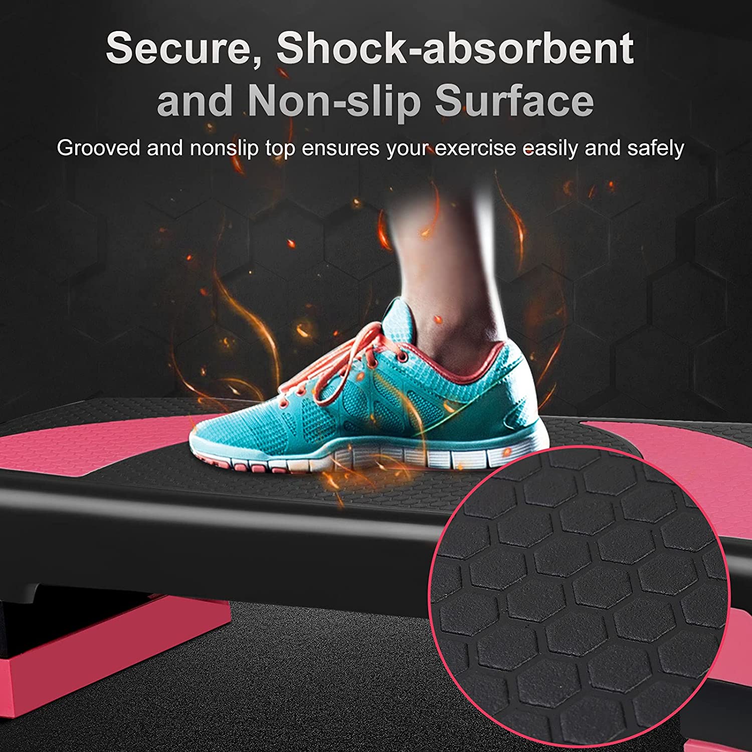• 【Anti-slip Design】Textured surface is non-slip and shock absorbing, meaning you can have stability with every single set of steps. Also comes with nonskid rubber feet on each riser to prevent it from sliding during exercise and scratching floors. Four additional rubber feet included.