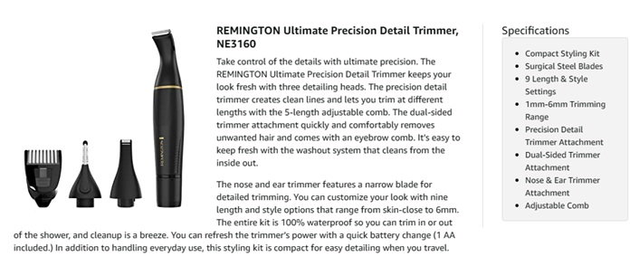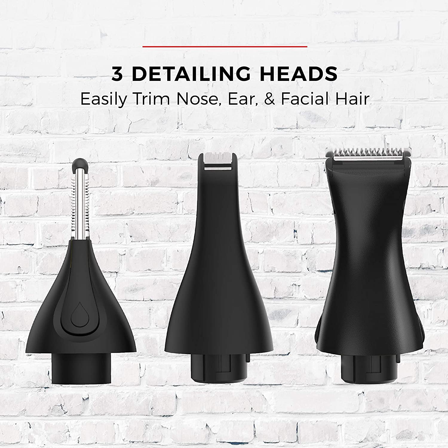 The Remington Ultimate precision detail trimmer keeps your look fresh with three detailing heads. The precision detail trimmer creates clean lines, and lets you trim at different lengths with the 5-length adjustable comb. The dual-sided trimmer attachment quickly and comfortably removes unwanted hair, and comes with an eyebrow comb. It's easy to keep fresh with the washout system that cleans from the inside out. The nose and ear Trimmer features a narrow blade for detailed trimming. You can customize your look with nine length and style Options that range from skin-close to 6mm. The entire kit is 100% waterproof so you can trim in or out of the shower, and cleanup is a breeze. You can refresh the trimmer's power with a quick battery change (1 AA included.).