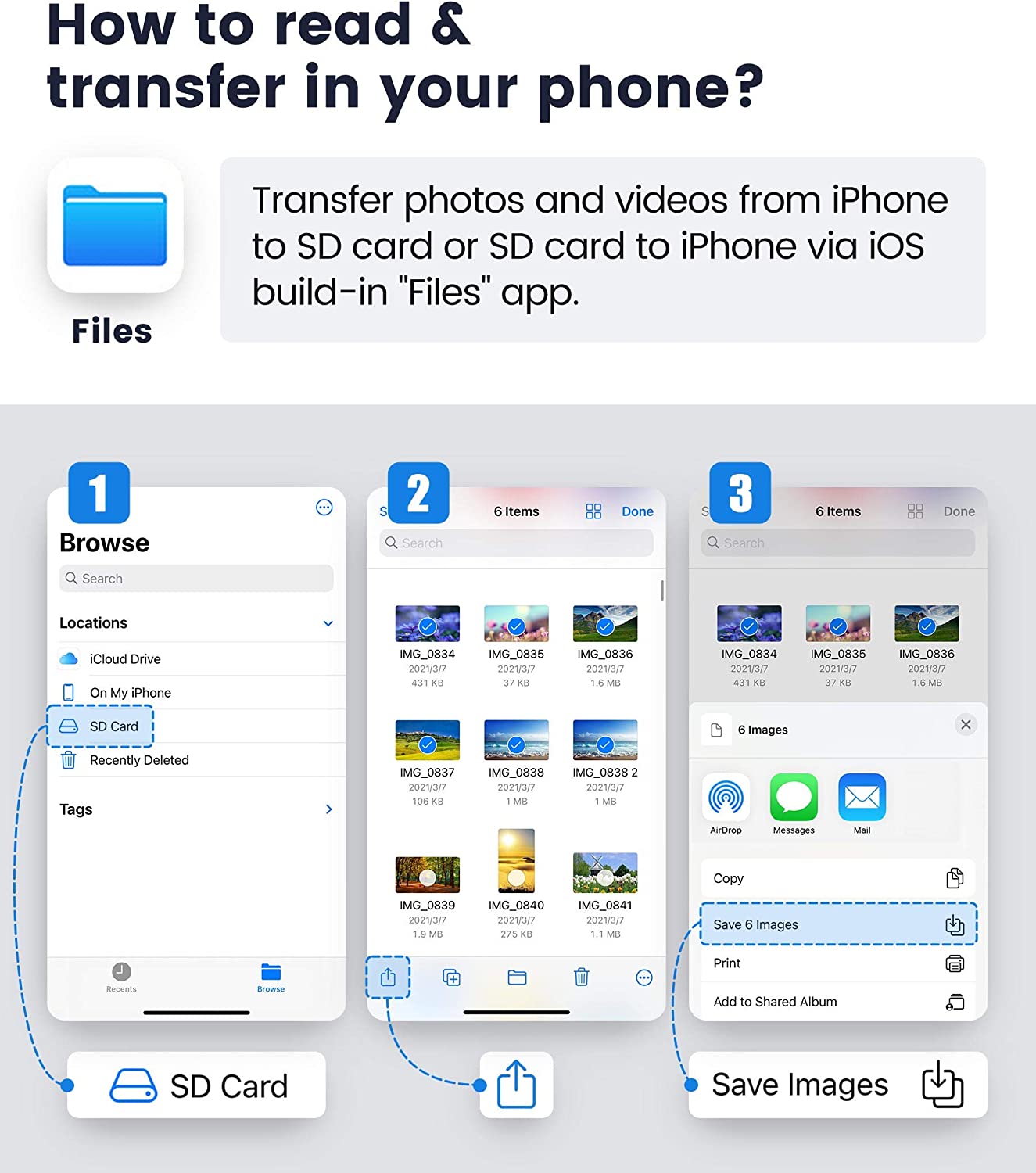 Two-way transfer : The SD Card Reader for iPhone supports two-way transfer,from SD card to iPhone or iPhone to SD memory cards.
