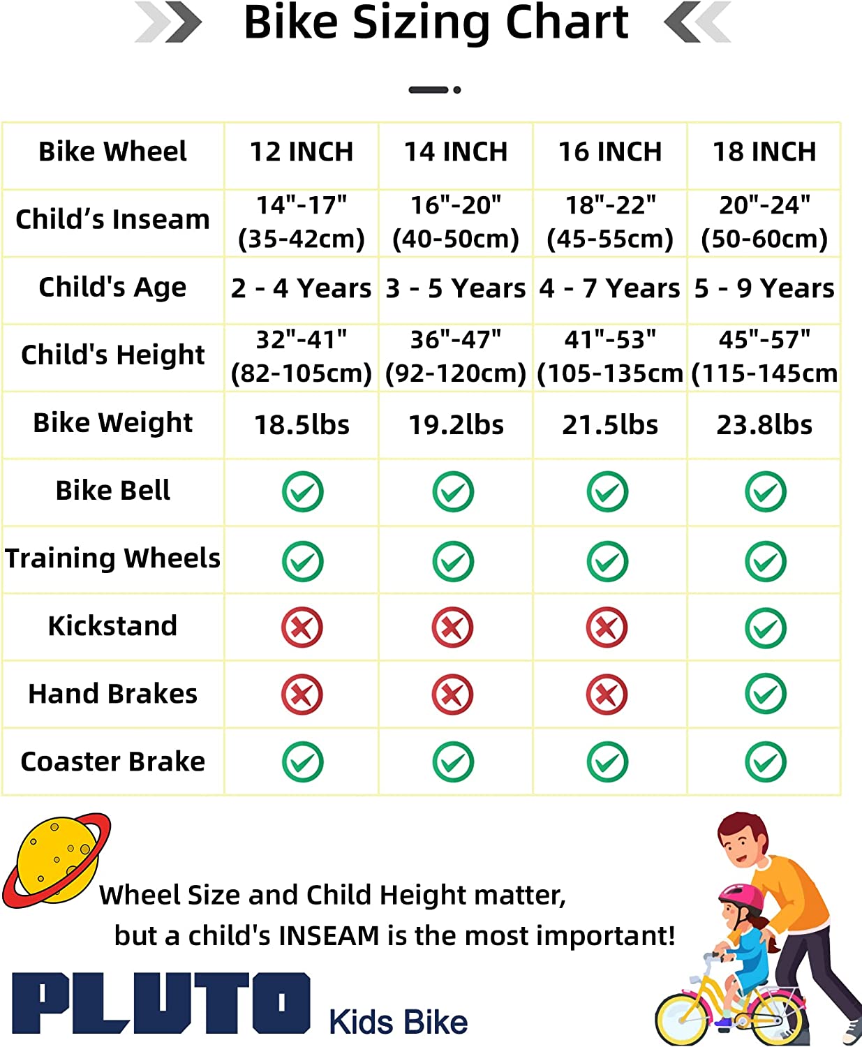 - 5. More Size Options! 14, 16, 18, 20 Inch available, the handlebars and seat height are all adjustable. Use our kids bike size chart, you'll find a perfect size for your little beloved. Note: Please take the kids height into consideration.