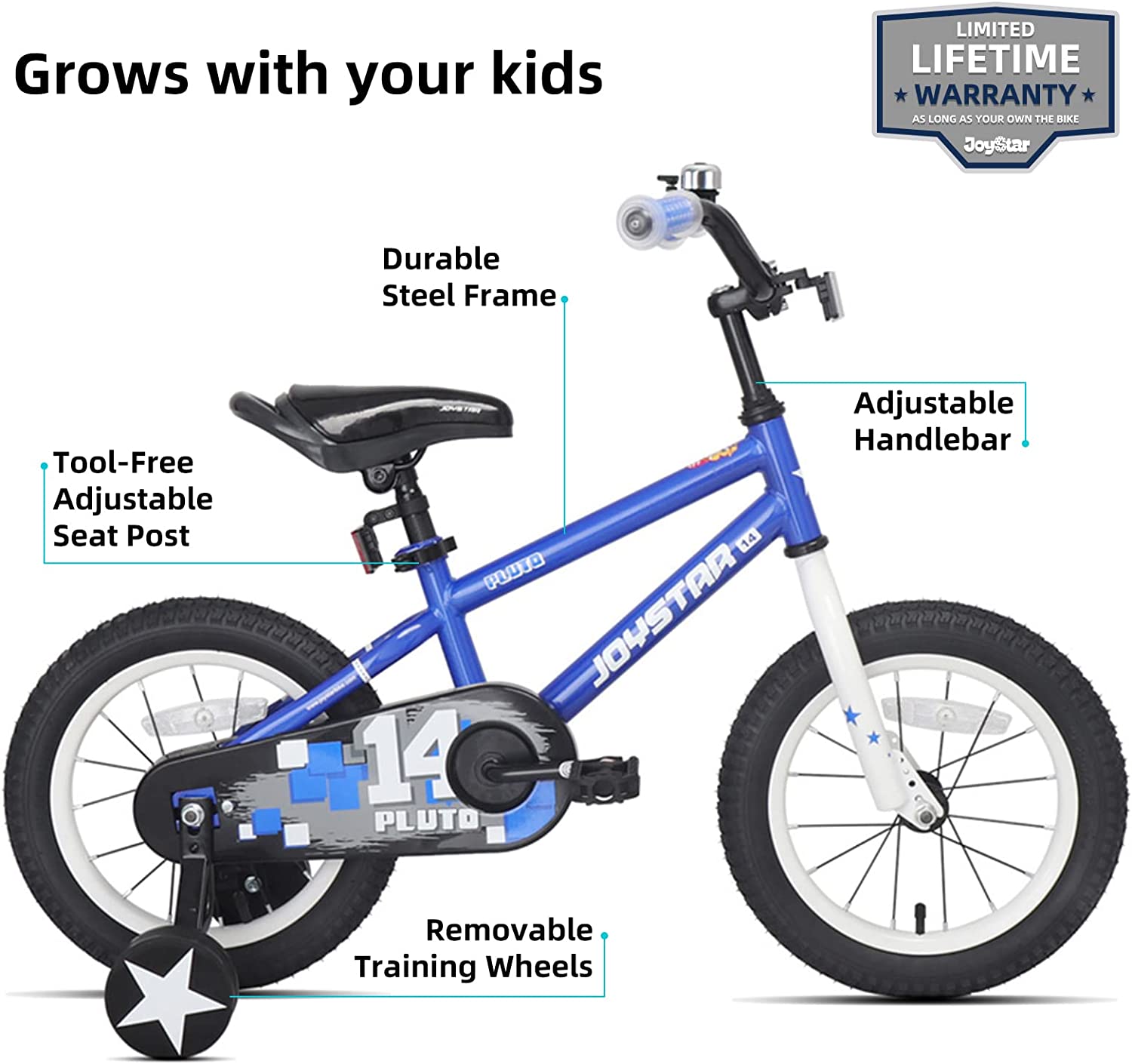 - 1. Amazing Design and Color! JOYSTAR PLUTO 2.0 Kids bike for boys girls with Bright dazzling colors, stylish and charming. DIY decals add extra fun to the ride. Soft seat offers more comfort in riding.
