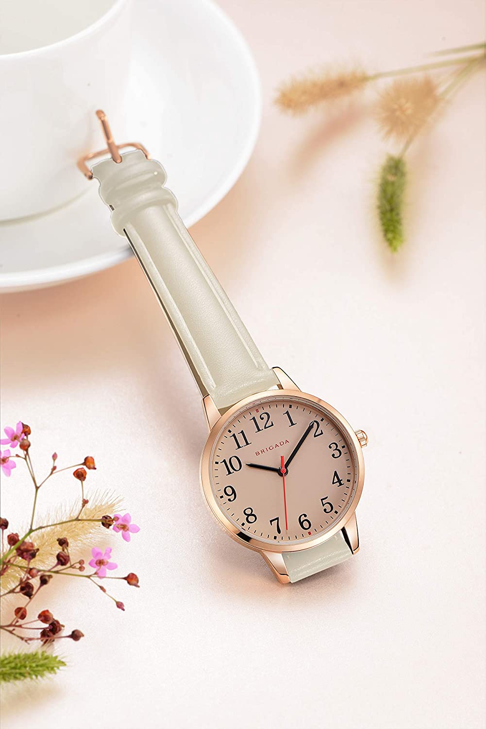• ❤Round rose gold dial with easy-to-read Arabic numeral scale make the timepiece keeping good time. Red second hand is elegant and eye-catching, rose gold case comes with soft and wear-resistant beige watch band, love at first sight.