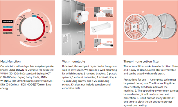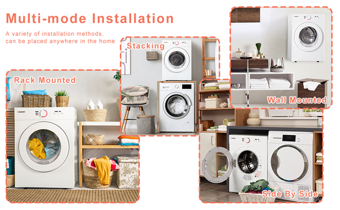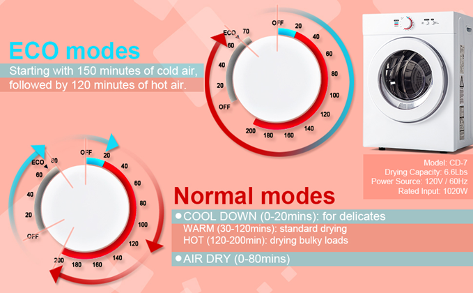 • 【Multi-function】 Our electric clothes dryer has easy-to-operate knobs and seven drying modes: COOL DOWN (0-20mins): for delicates; WARM (30-120mins): standard drying; HOT (120-200min): drying bulky loads; ANTI-WRINKLE (30-60min): wrinkle prevention; AIR DRY (0-80mins); INTELLIGENT: Portable dryer can adjust the heating time according to humidity; ECO MODE: Save energy.