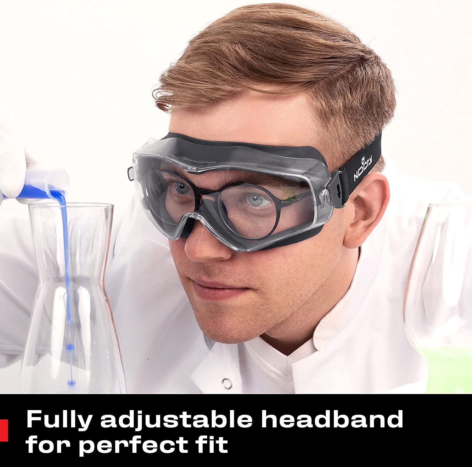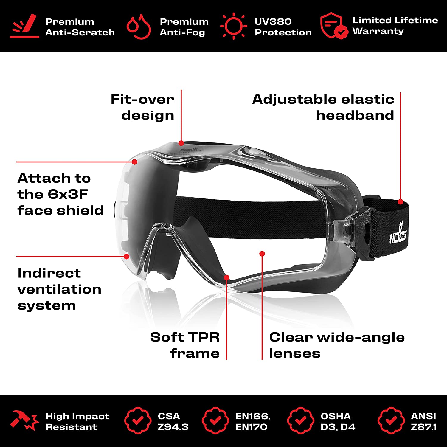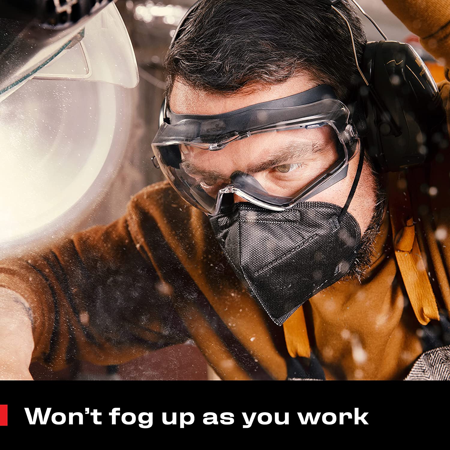 WRAP-AROUND ANTI FOG SAFETY GOGGLES. On top of a premium UDC anti-fog and anti-scratch coating, these clear lenses also come with complete UV protection. The wide-angle lenses are impact resistant at up to 260 mph, offering serious eye protection.