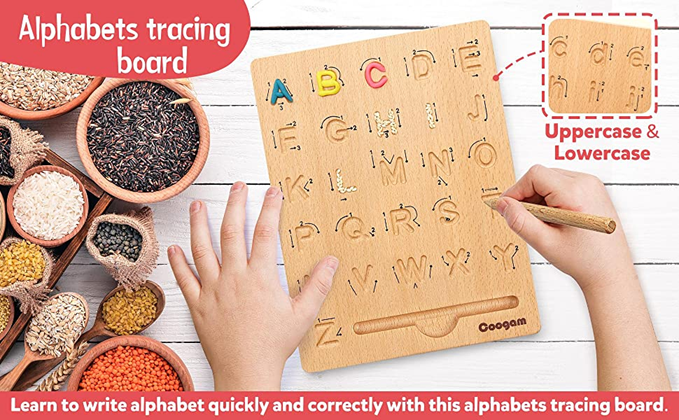 - Double-sided Design: The wooden letters tracing board is double-sided. It has upper case letters on one side and lower case on the other. Each alphabet has directional arrows to help the proper order and direction of the strokes. The child can see where they should start each line and the direction.