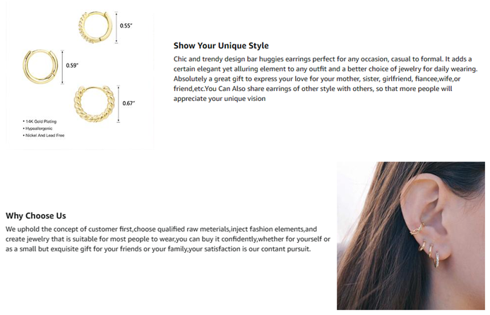 • 14k gold plated brass small huggie hoop earrings. Hypoallergenic, Nickel and Lead-Free, no rust and fading. Flexible clasp, easy to open and close. If the clasp not easy to close, you can adjust the earpins