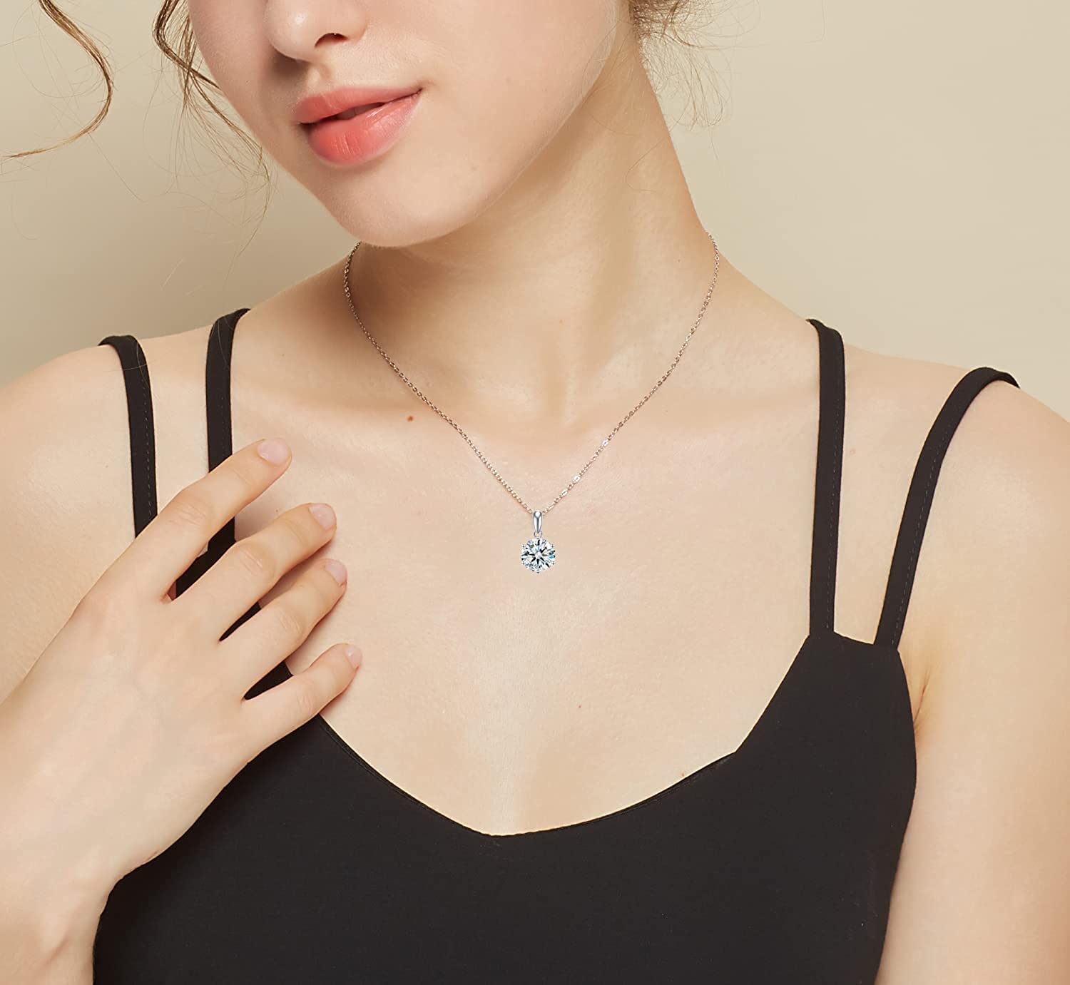 • 【TOP GRADE MOISSANITE】: This moissanite necklace for women with center stone 2ct (Dia 8 mm). D-E color grade make it looks clear, pendant setting metal is 18k white gold Over Sterling Silver. The stones feature hand made setting instead of wax setting, to ensure our stones are stronger and safer on the setting; On the other hand, the hand made setting will make the stones look more neat and will not uneven, to ensure a high-end outlook.