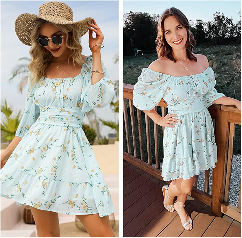 EXLURA Women's Lantern Sleeve Tie Back Casual Dresses Ruffled Off Shoulder A-Line Vintage Mini Dress