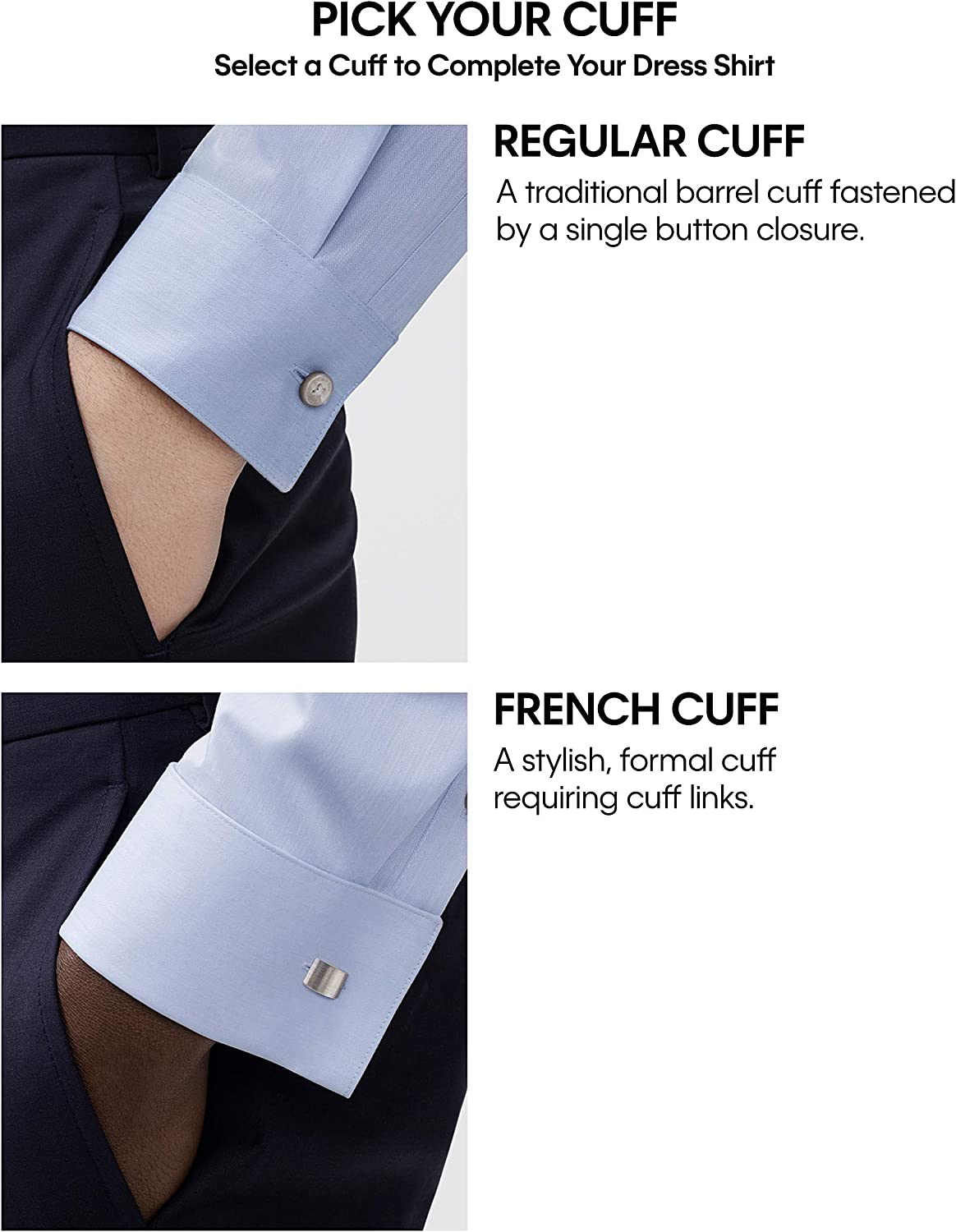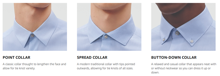 • Your choice between 3 collars & 2 cuffs: select a spread, point or button-down collar, and whether you want 2-button adjustable barrel cuffs or French cuffs to show off your best cufflinks