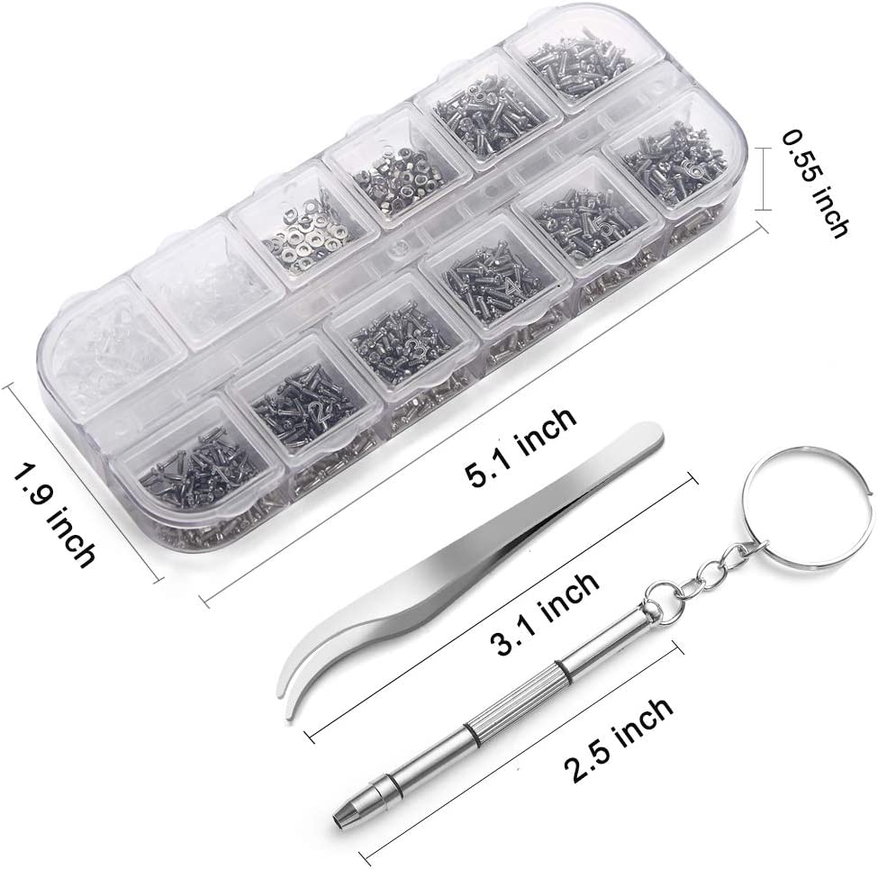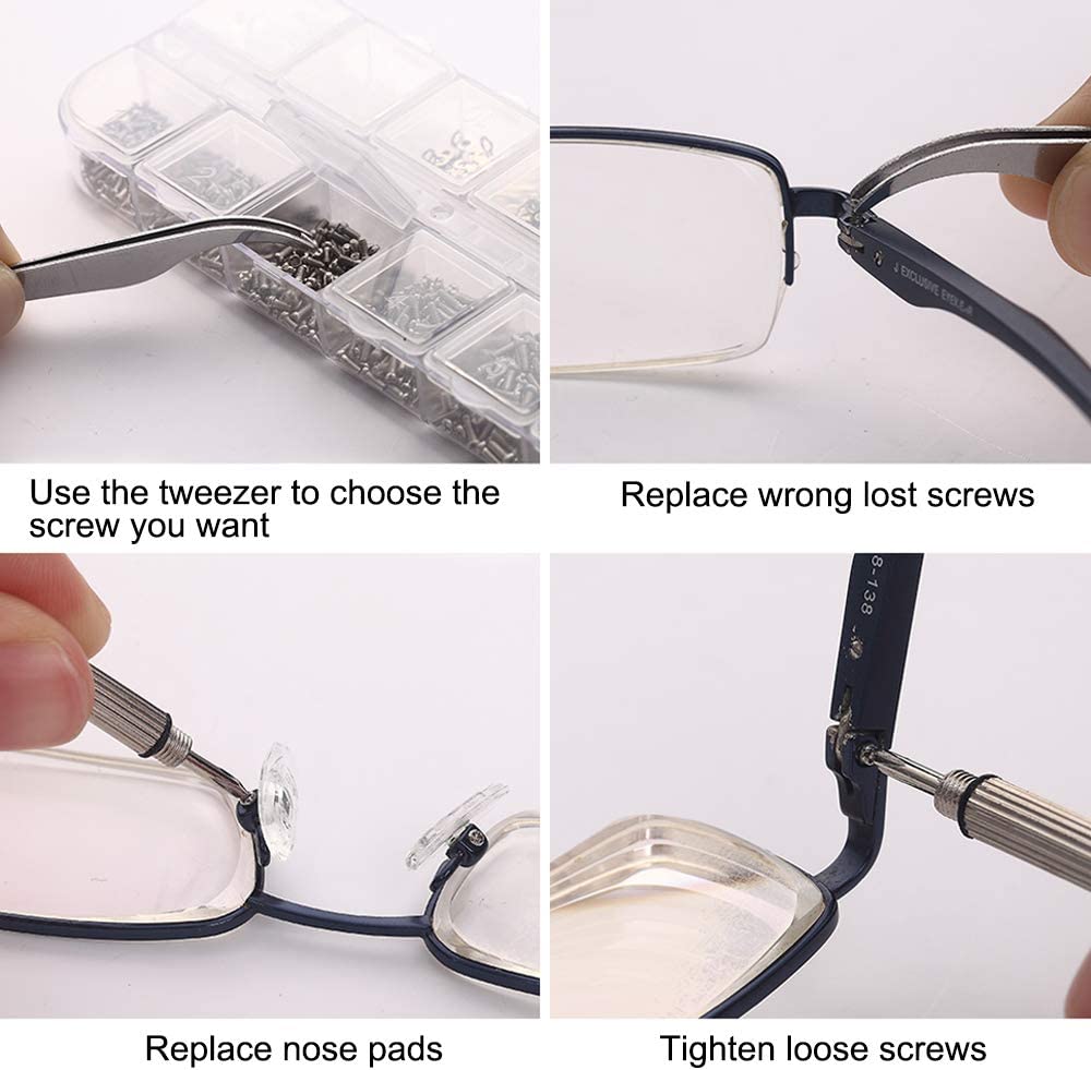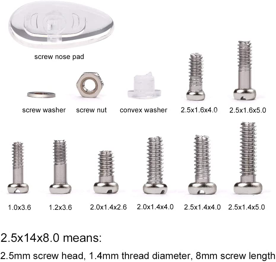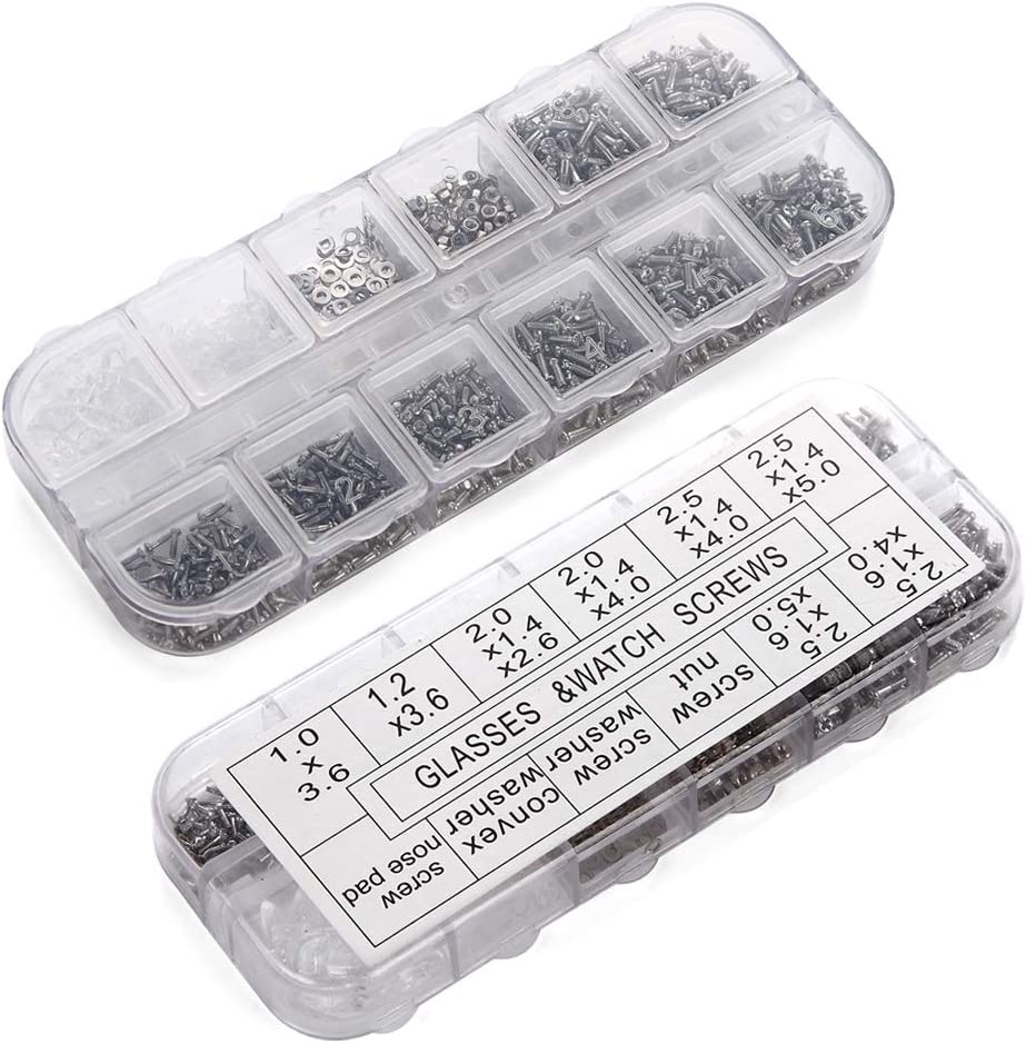 • WHAT YOU WILL GET? - 1100 pieces assorted tiny screws, screw nuts, screw washer, convex washer and 5 pairs of screw nose pads packed with one micro screwdriver and one tweezer. A perfect kit for eyeglasses and watch repair.