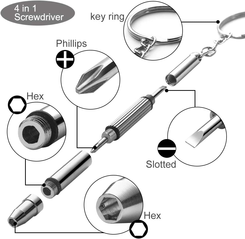• MULTI-FUNCTION SCREWDRIVER - 4 in 1 Stainless Steel Screwdriver Keychain Precision Eyeglass Repair Tool, 3 in 1 Mini Screwdriver: Flat head screwdriver/ Phillips screwdriver/ Hex socket nut drivers.