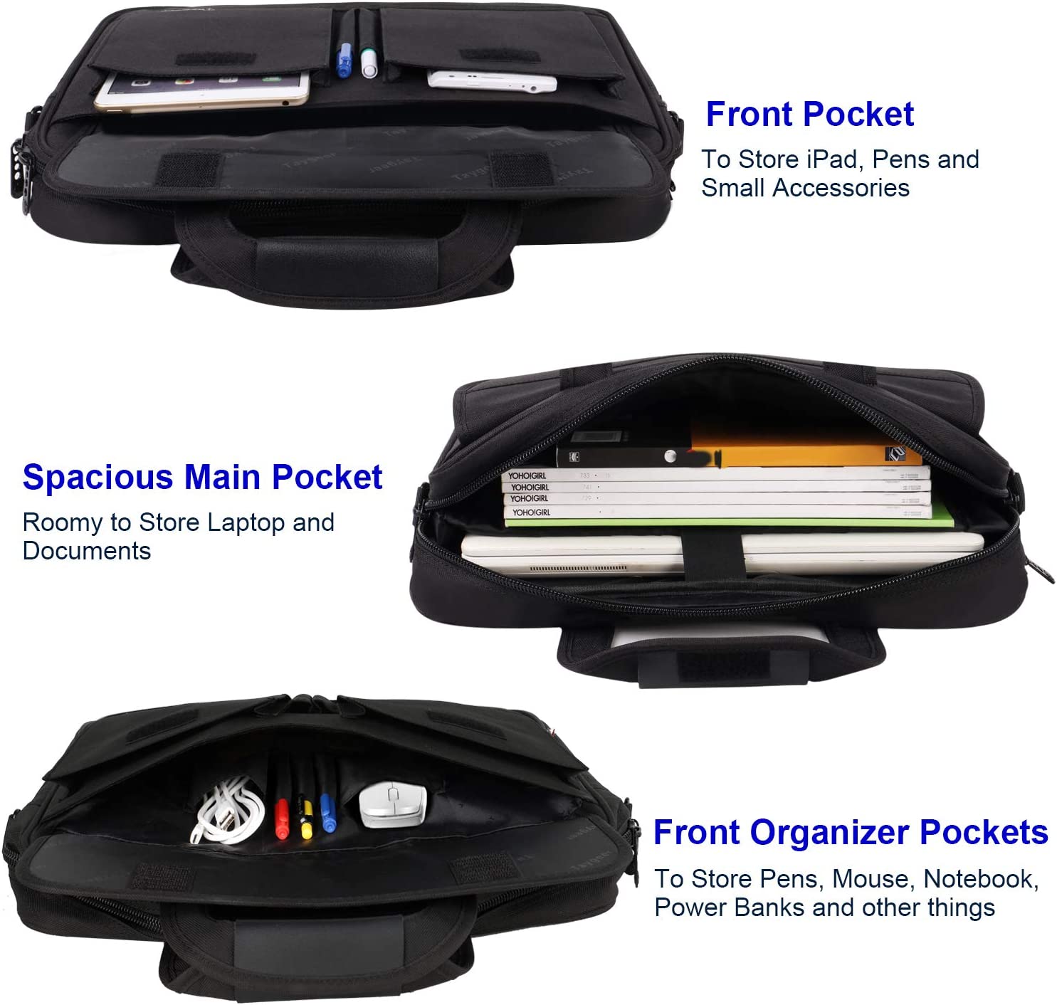 • Multi-Compartment Organizer: The computer bag includes external 2 pouches & 2 pen slots and inside several slots in front large pocket with magic tape under flap over, storage pen holders, documents, binder, power cords, mouse; 1 main zipper Pocket with foam padded sleeve fits most 15 15. 6 inch Laptop notebooks MacBook Ultrabook Chromebook; back invisible zipper pocket for your valuables