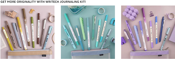 - This Journaling Kit includes 4 Dual Tip Brush Pens, 2 Retractable Gel Pens, 2 Retractable Highlighters, 1 Black Fineliner and a Pen Bag easy to carry. Writech offers 5 different coordinated color combinations to provide different creative inspiration.