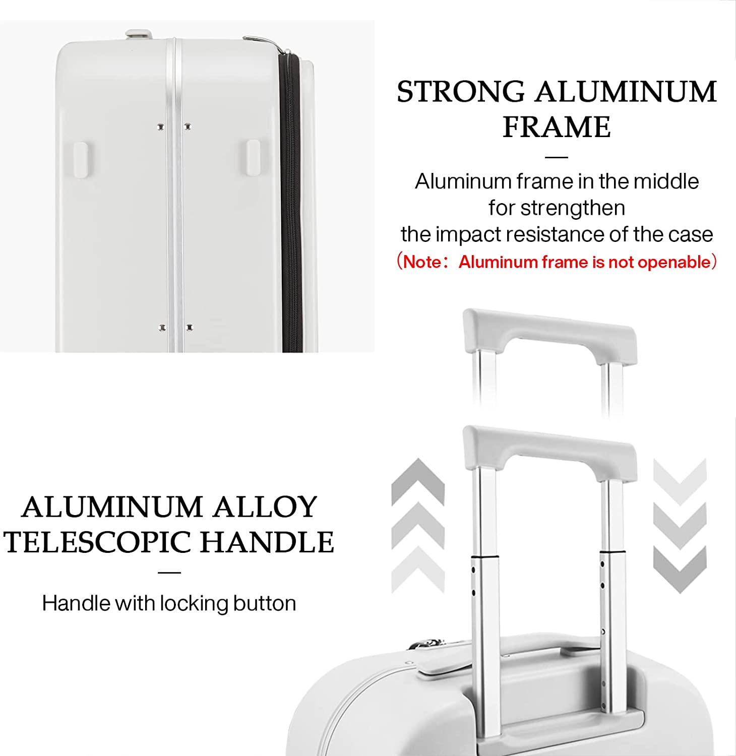 【DURABLE TRAVEL SUITCASE】Benefits from German Bayer PC material to prevent easily cracking or breaking, and Aluminum frame in the middle strengthen the impact resistance of the case, makes it more solid. (Aluminum frame is not openable)