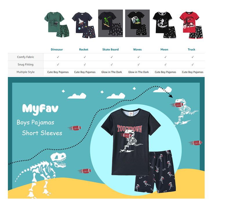 Cute Cartoon Patterns Design: Cute cartoon printed pajamas set specially designed for your boys, the top has a dinosaur print on it, fashionable and stylish, kids favorite. It's the very popular and catch-eye design with every child.