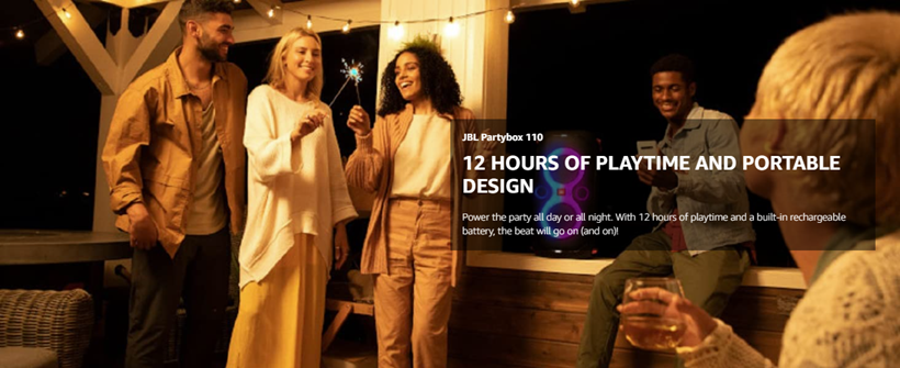 - POWERFUL JBL ORIGINAL PRO SOUND: Whether you're at home or outdoors, the JBL PartyBox 110 makes your music amazing with two levels of deep, adjustable bass and 160W powerful JBL Signature Sound.