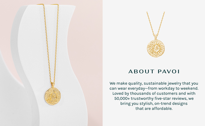 • ✦ SUSTAINABILITY ✦ PAVOI is dedicated to sustainability throughout our entire product cycle. Our jewelry is made from 100% recycled materials and we package in 99% recycled and compostable materials. We work to reduce our carbon emissions and offset plastic consumption by removing 275,000 bottles from oceans annually. We are committed to maintain a balanced and eco-friendly business that minimizes our environmental impact. Trust that PAVOI is continuously working towards a greener future.