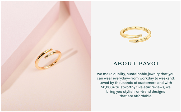 • ✦ SUSTAINABILITY ✦ PAVOI is dedicated to sustainability throughout our entire product cycle. Our jewelry is made from 100% recycled materials and we package in 99% recycled and compostable materials. We work to reduce our carbon emissions and offset plastic consumption by removing 275,000 bottles from oceans annually. We are committed to maintain a balanced and eco-friendly business that minimizes our environmental impact. Trust that PAVOI is continuously working towards a greener future.