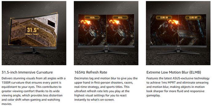 Designed for fast-paced games, the TUF Gaming VG32VQ1B is a 31.5” curved gaming display that boasts a 165Hz refresh rate. Equipped with Extreme Low Motion Blur (ELMB), VG32VQ1B eliminates motion blur for a smoother gaming experience, while FreeSync Premium technology eliminates screen tearing and choppy frame rates.