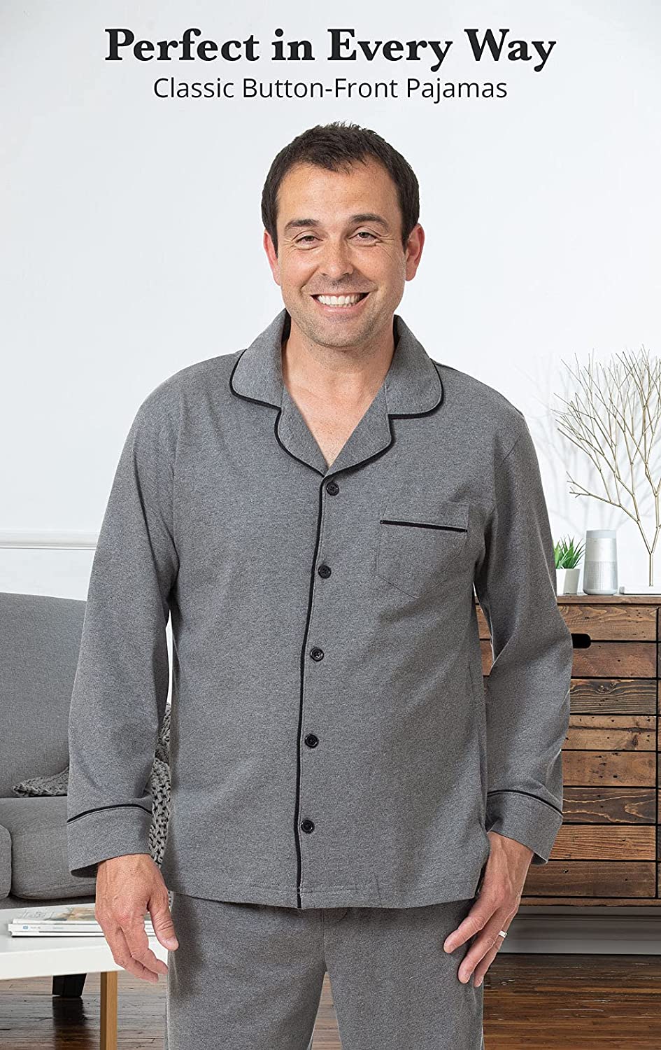 • Traditional Button-Up Style - Comfy mens pajama set features a button-up top with a notched collar and chest pocket for the timeless appeal of dress shirt styles; pants feature side pockets; contrast jersey piping adds a classic look to these two-piece pjs that men love.