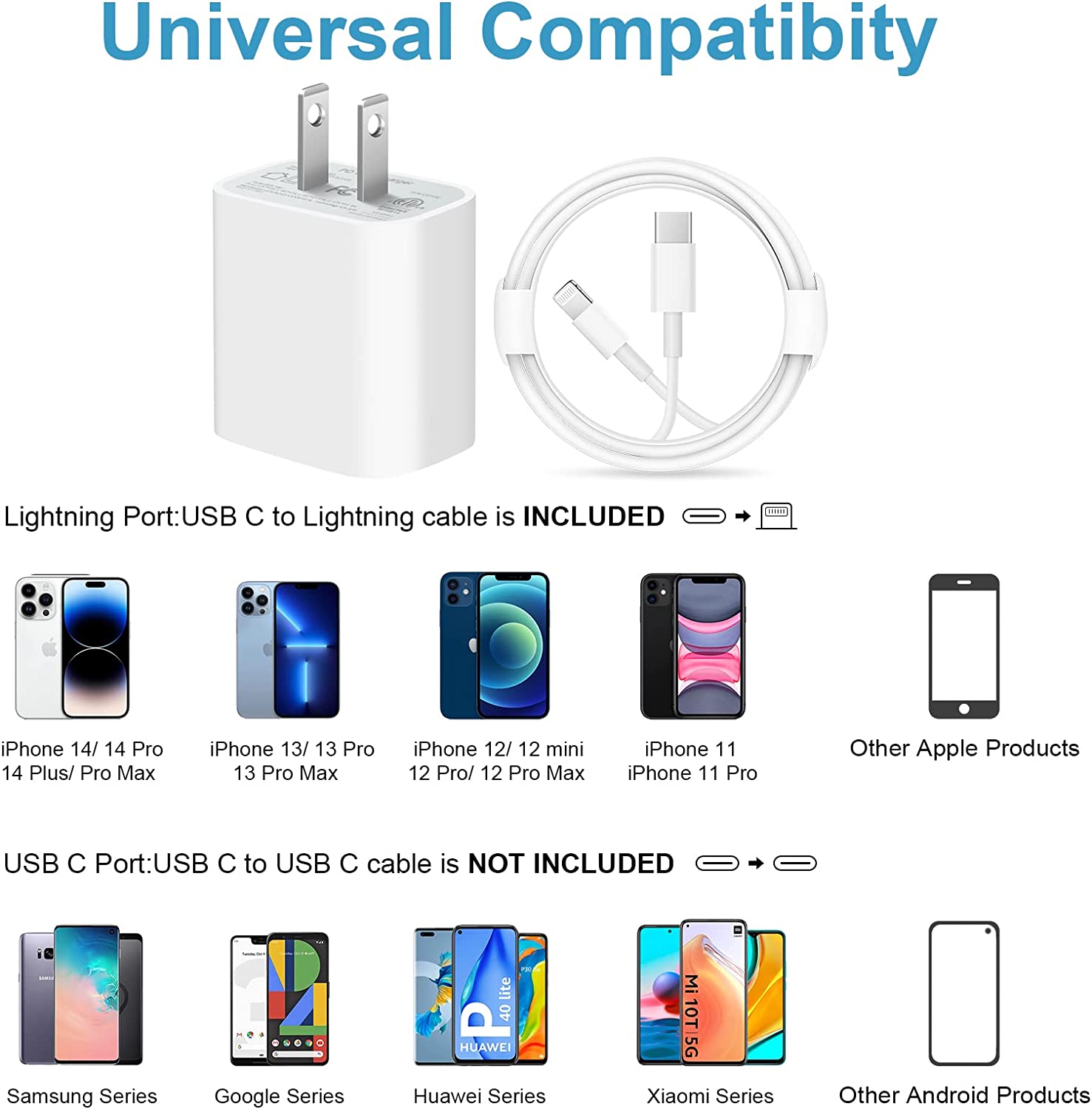Package included: 2 x USB-C wall charger, 2 x 6 FT Fast Charging iPhone cable